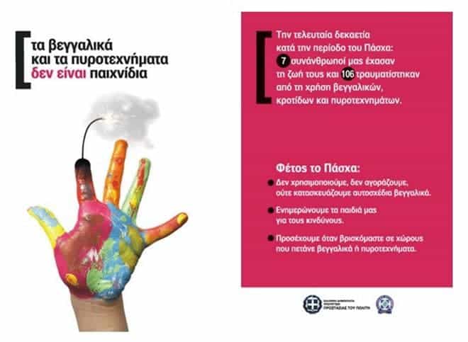Κάθε χρόνο, πριν και κατά τη διάρκεια των Εορτών του Πάσχα, γινόμαστε μάρτυρες σοβαρών ατυχημάτων, ιδιαίτερα σε ανήλικους, εξαιτίας της επικίνδυνης συνήθειας καύσης κροτίδων, πυροτεχνημάτων και βεγγαλικών, παρόλο που κάτι τέτοιο απαγορεύεται από το νόμο.